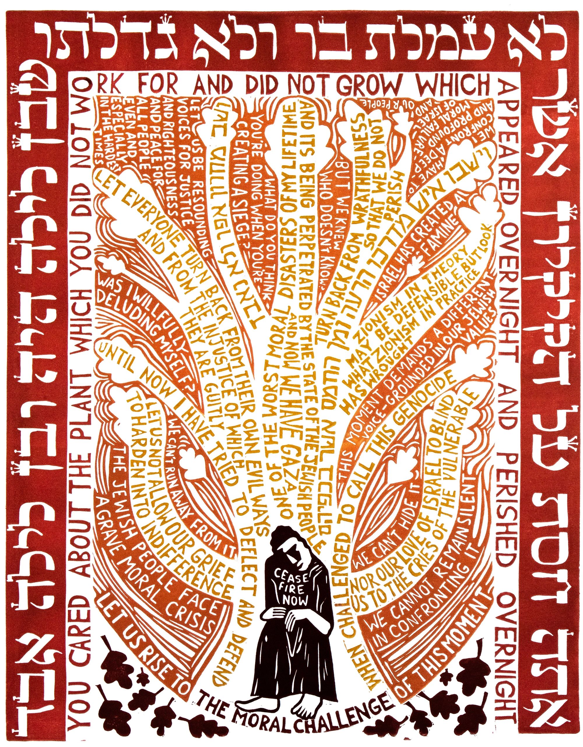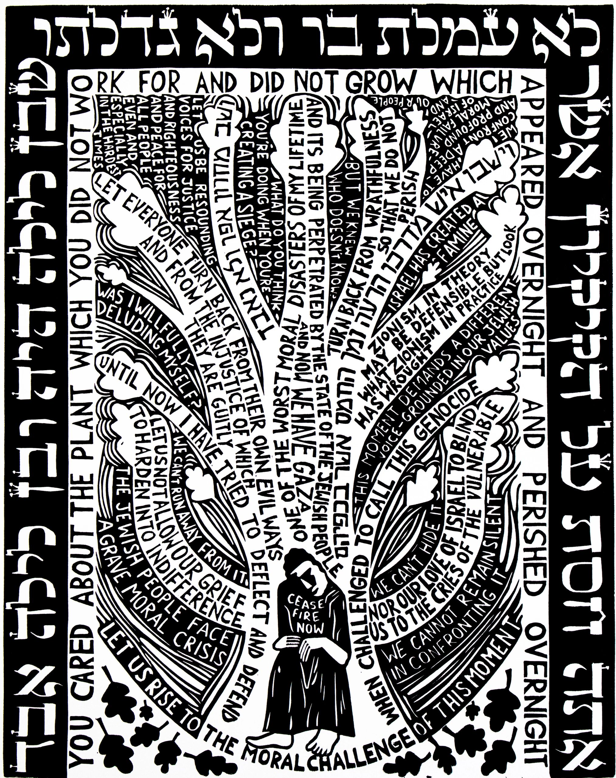 Text from Exodus 32, and fragments from Rabbi Abraham Joshua Heschel’s “Kaddish for Our Souls,” “The Meaning of This War,” and “The Moral Outrage of Vietnam.” I was inspired by Marc Chagall’s “Moses Breaking the Tablets of Law” and by the fresco from the Dura Europos synagogue in Syria depicting the scene of the golden calf, made c. 244-256 CE.