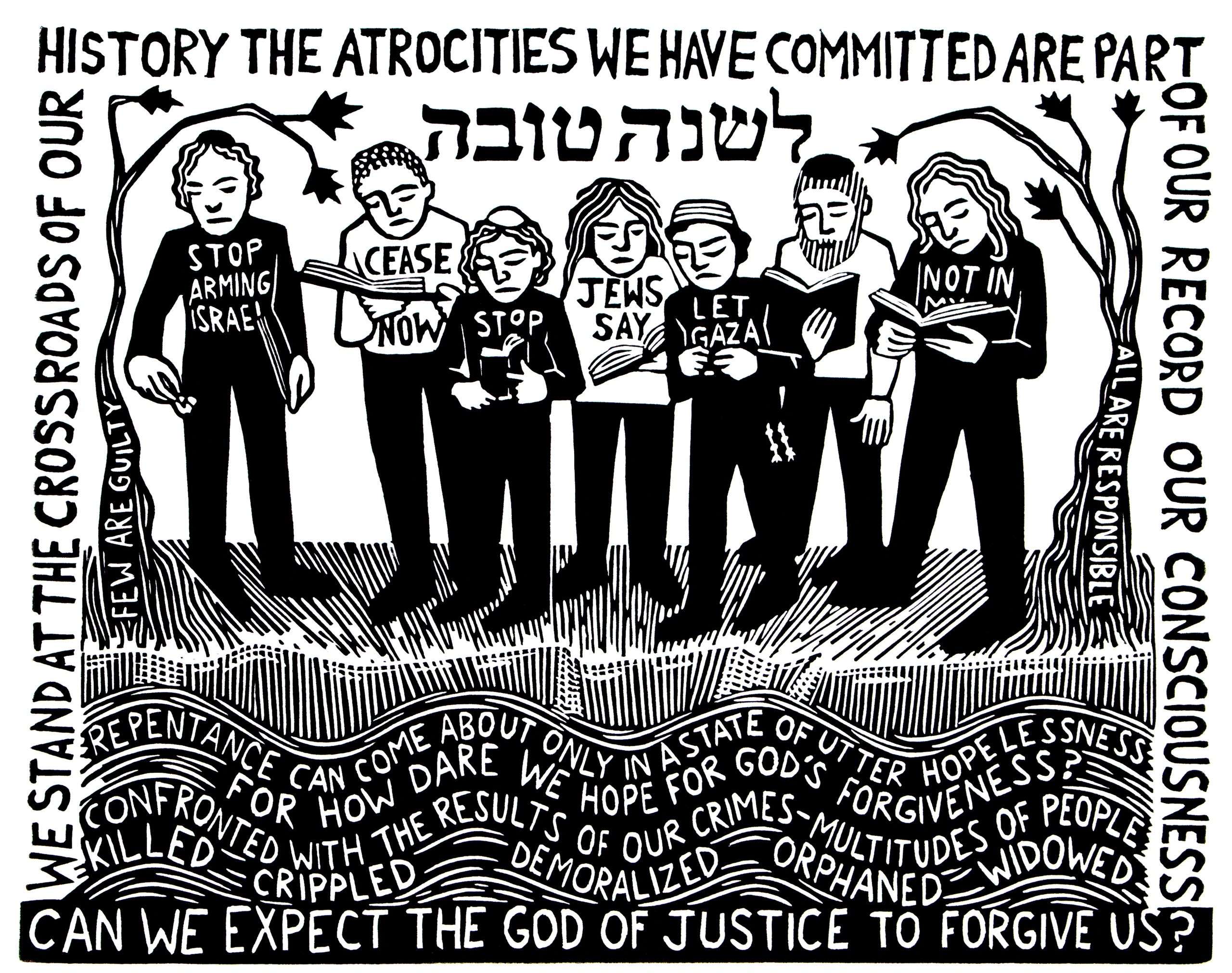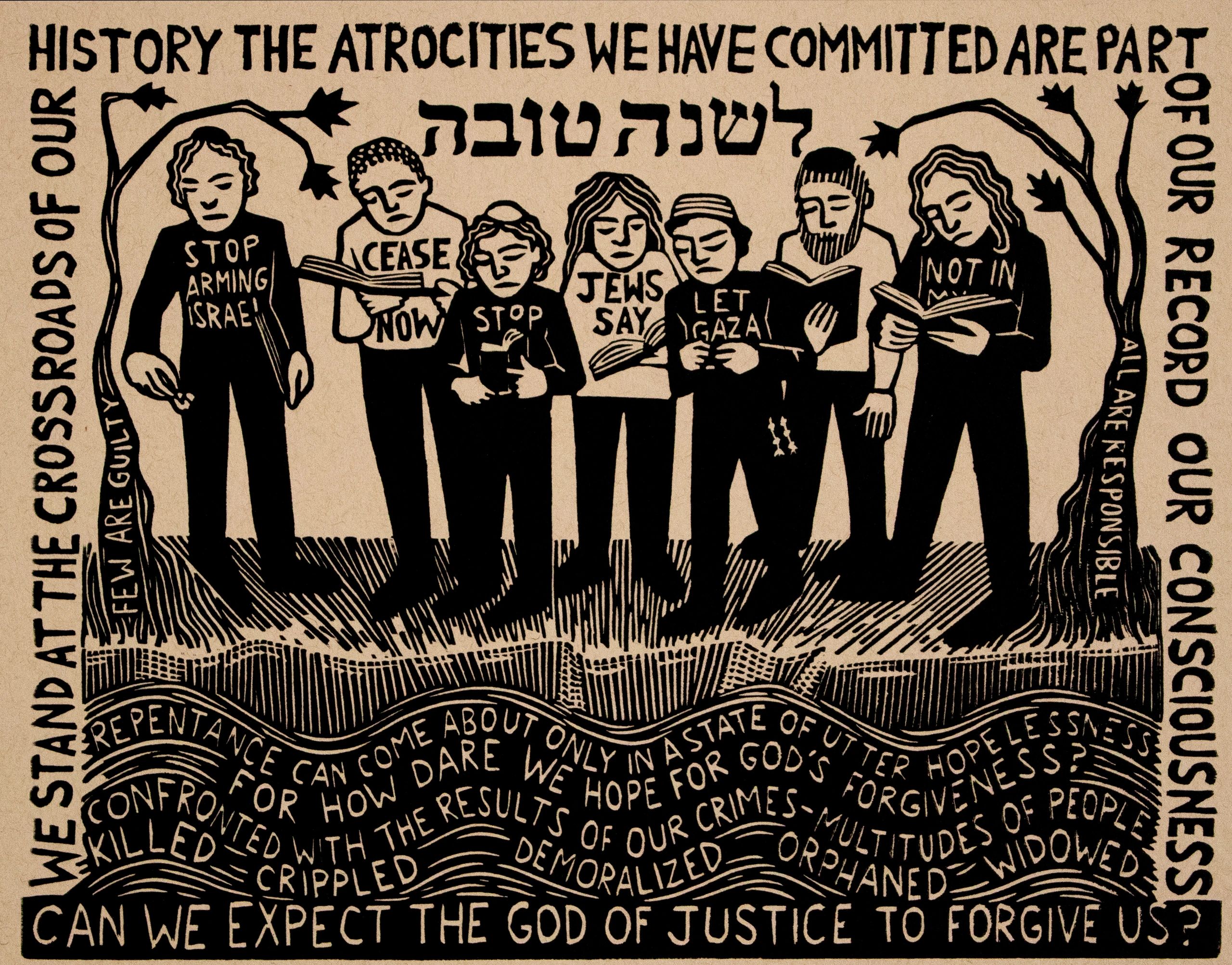 “Tashlich." 9x12" rubber cut print. Text from Abraham Joshua Heschel’s “Required: A Moral Ombundsman” arranged as a Rosh HaShanah card depicting the ritual of Tashlich, in which we “cast off” our sins.